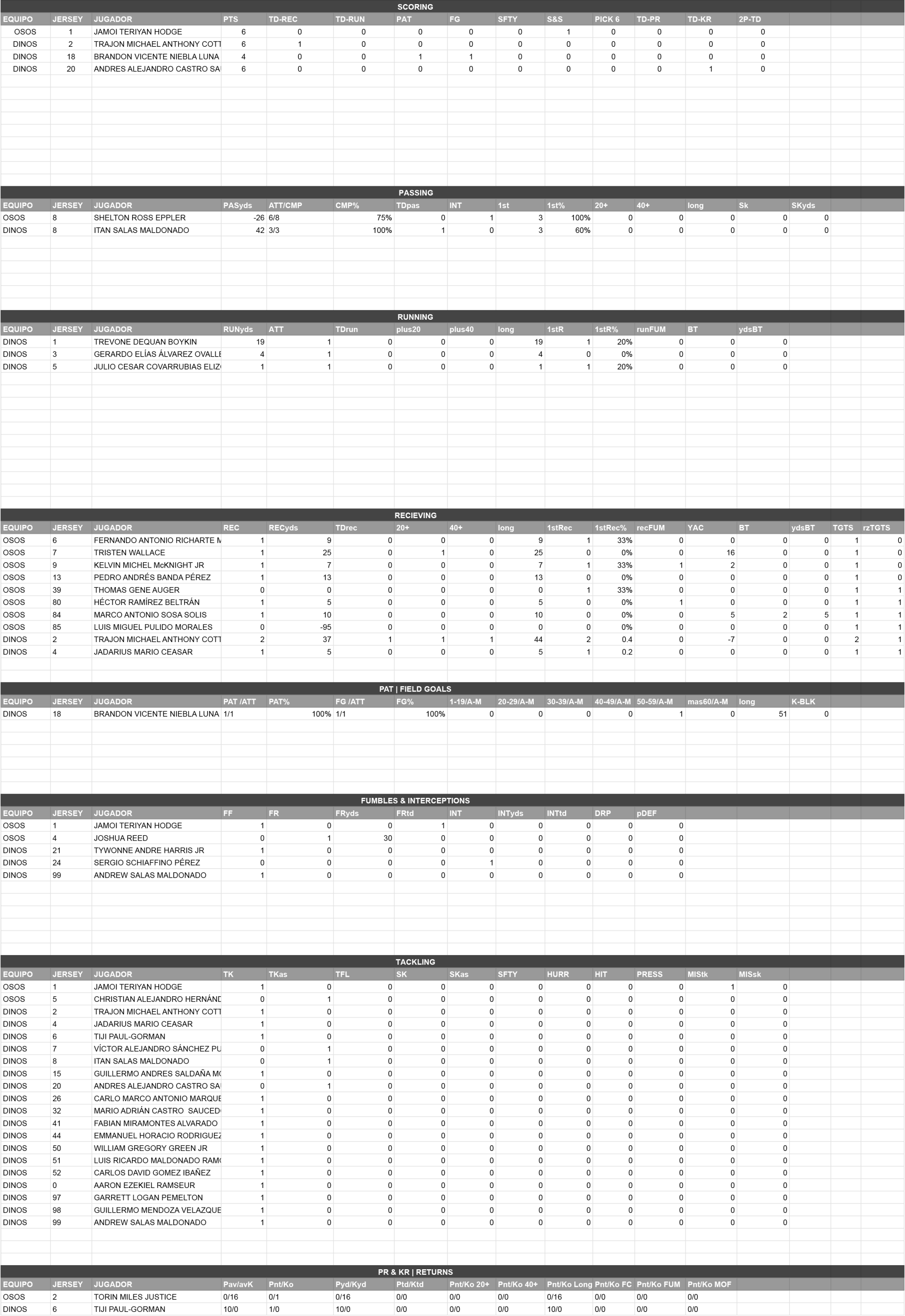 | Position | Att | Comp | RushYds | TDrun | Rec | Rec Yds | TDpas | Int | Lng | Fum | Lost |